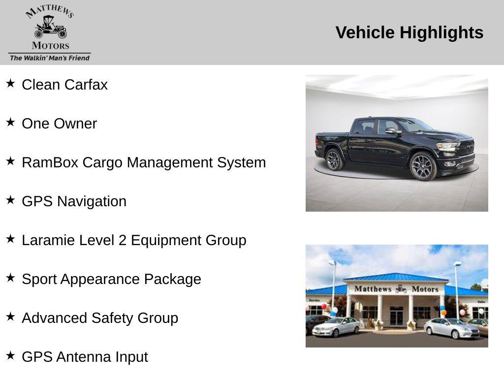 **Save time, Buy Online with Matthews Motors Express Point.Click.Buy**We have over 300 certified pre-owned vehicles, most come with a lifetime powertrain, engine and transmission warranty. There's a variety of reasons why our customers continue to return to our 4 conveniently located showrooms throughout North Carolina. Which are a few of the reasons we have been awarded CIADA Quality Dealer of The Year and the BBB Torch Award Winner. Here at Matthews Motors we're committed to providing the ultimate automotive dealership experience.Clean Carfax, One Owner, RamBox Cargo Management System, 3 Rear Seat Head Restraints, 4 Way Front Headrests, 8.4"" Touchscreen Display, Adaptive Cruise Control w/Stop & Go, Advanced Brake Assist, Advanced Safety Group, Apple CarPlay, Auto High Beam Headlamp Control, Black Interior Accents, Blind Spot & Cross Path Detection, Body Color Door Handles, Body Color Front Bumper, Body Color Rear Bumper w/Step Pads, Bucket Seats, Center Console Parts Module, Disassociated Touchscreen Display, Dome Dual LED Reading Lamp, Driver Seat Memory, Dual-Pane Panoramic Sunroof, Front Seat Back Map Pockets, Full Length Upgraded Floor Console, Full Speed Forward Collision Warning Plus, Fully automatic headlights, GPS Antenna Input, GPS Navigation, harman/kardon 19 Speaker Premium Sound, HD Radio, Heated Front Seats, Heated Second Row Seats, Heated Steering Wheel, Integrated Center Stack Radio, Lane Keep Assist, Laramie Level 2 Equipment Group, Leather Trimmed Bucket Seats, LED Dome/Reading Lamp, No Satellite Coverage w/HI/AK/PR/VI/GU, Parallel & Perp Park Assist w/Stop, ParkSense Front/Rear Park Assist w/Stop, ParkView Rear Back-Up Camera, Power 4-Way Driver Lumbar Adjust, Power 4-Way Passenger Lumbar Adjust, Power 8-Way Driver & Passenger Seats, Power Heated Fold-Away Mirrors, Radio: Uconnect 4C Nav w/8.4"" Display, Rain Sensitive Windshield Wipers, Rear 60/40 Folding Split Recline Seat, Rear Underseat Compartment Storage, Remote Tailgate Release, Single Disc Remote CD Player, SiriusXM Satellite Radio, SiriusXM Traffic Plus, SiriusXM Travel Link, Sport Appearance Package, Sport Performance Hood, Tailgate Ajar Warning Lamp, Ventilated Front Seats, Wheels: 20"" x 9"" Premium Painted w/Inserts, Wireless Charging Pad.Recent Arrival! Clean CARFAX.