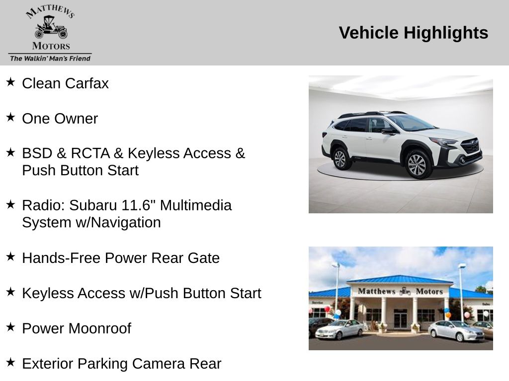 **Save time, Buy Online with Matthews Motors Express Point.Click.Buy**We have over 300 certified pre-owned vehicles, most come with a lifetime powertrain, engine and transmission warranty. There's a variety of reasons why our customers continue to return to our 4 conveniently located showrooms throughout North Carolina. Which are a few of the reasons we have been awarded CIADA Quality Dealer of The Year and the BBB Torch Award Winner. Here at Matthews Motors we're committed to providing the ultimate automotive dealership experience.Clean Carfax, One Owner, Auto High-beam Headlights, Blind Spot Detection (BSD), BSD & RCTA & Keyless Access & Push Button Start, Exterior Parking Camera Rear, Hands-Free Power Rear Gate, Keyless Access w/Push Button Start, Power Moonroof, Radio: Subaru 11.6" Multimedia System w/Navigation, Rear Cross Traffic Alert (RCTA).Recent Arrival! Clean CARFAX. Odometer is 4420 miles below market average! 26/32 City/Highway MPG