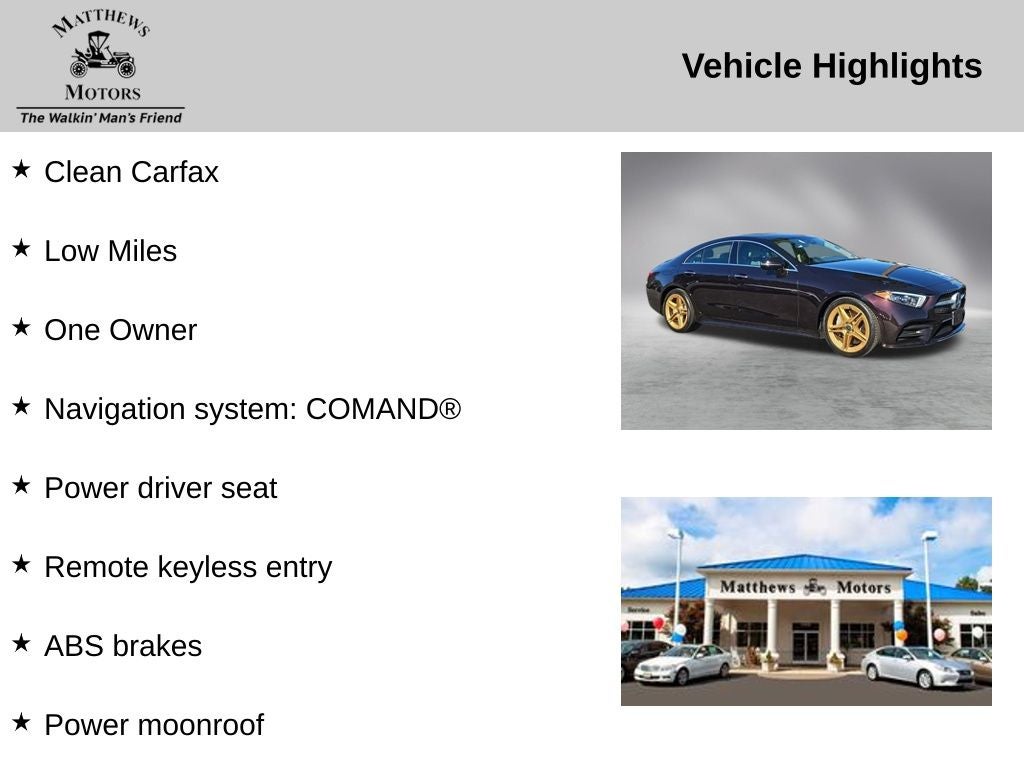 Clean Carfax, Low Miles, One Owner, ABS brakes, Alloy wheels, Apple CarPlay®/Android Auto®, Brake assist, Exterior Parking Camera Rear, Front Bucket Seats, Heated Power Front Bucket Seats, Navigation system: COMAND®, Power driver seat, Power moonroof, Remote keyless entry.