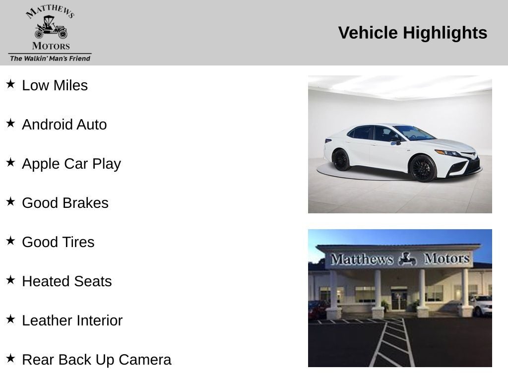 Low Miles, Android Auto, Apple Car Play, Good Brakes, Good Tires, Heated Seats, Leather Interior, Rear Back Up Camera, Black w/Perforated Leather Seat Trim, ABS brakes, Alloy wheels, Electronic Stability Control, Front dual zone A/C, Heated door mirrors, Illuminated entry, Low tire pressure warning, Remote keyless entry, Traction control.